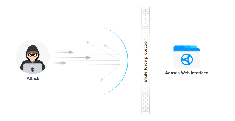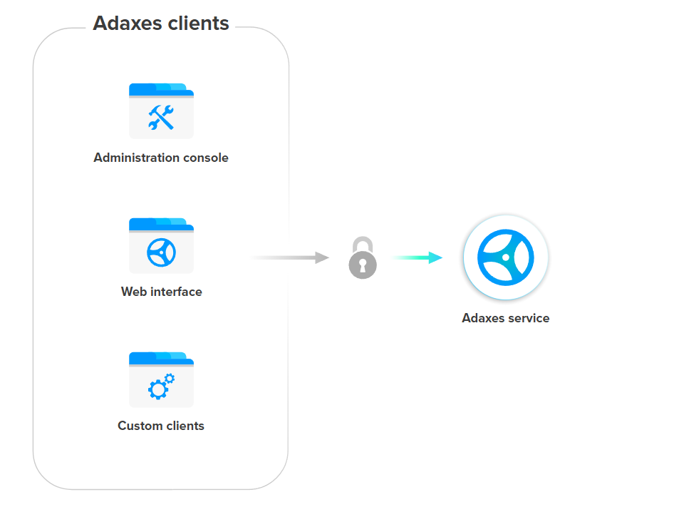 การรับส่งข้อมูลทั้งหมดระหว่าง Adaxes Service และ Adaxes Client ต่าง ๆ เช่น Administration Console และ Web Interface จะดำเนินการผ่านช่องทางที่มีการเข้ารหัส (Encrypted Channel) เสมอ เพื่อปกป้องข้อมูลและการเชื่อมต่อจากการเข้าถึงที่ไม่ได้รับอนุญาต